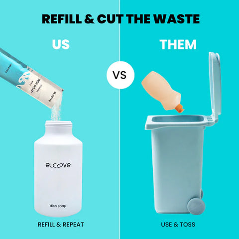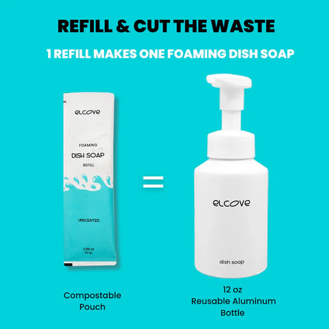 Includes: 1 sleek reusable aluminum bottle + 3 concentrated dish soap refills
