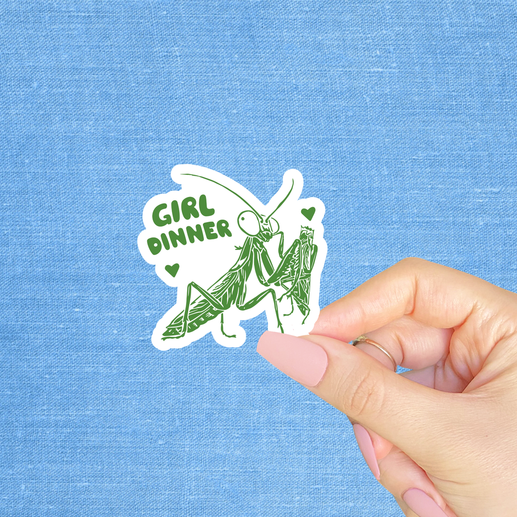 Girl dinner Each sticker measures approximately 2.75” by 2.5” inches It is printed on glossy sticker paper and laminated with vinyl.