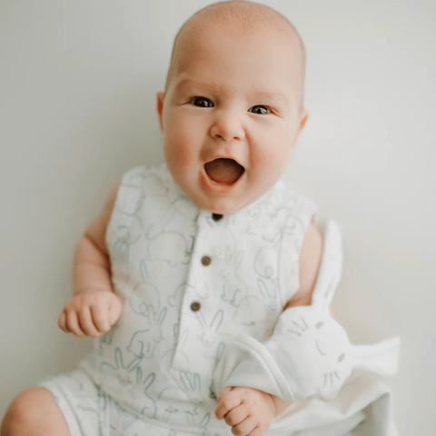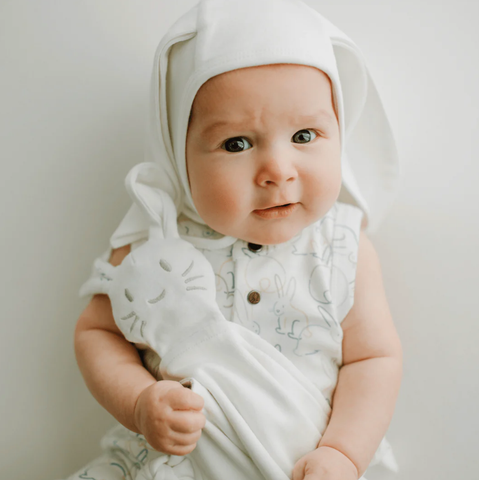 Our buttery soft fabric bunny was hand made out of G.O.T.S. certified organic cotton. Ivory face and belly and Bunnies print back.