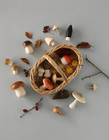 Beautifully made set of 15 wooden mushrooms in a handmade rattan basket for pretend play, nature study & decoration.