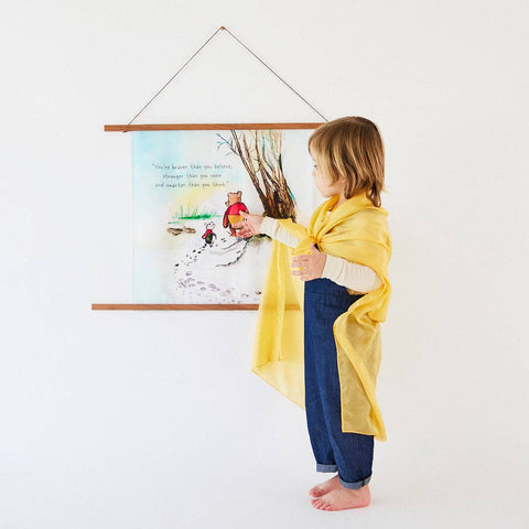 This Winnie-the-Pooh Playsilk features a beloved quote paired with a classic illustration of Pooh and Piglet walking together. Thoughtfully designed for play or display, it offers a gentle visual reminder that can be woven into everyday moments, whether used during imaginative play, quiet time, or in a cozy space.